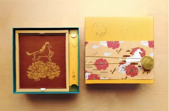 這是臺(tái)灣東西設(shè)計(jì)室的月餅作品,該設(shè)計(jì)室曾在2015年獲得紅點(diǎn)設(shè)計(jì)獎(jiǎng)。該月餅系列為“舞馬迎春禮盒”,以“天地運(yùn)行”為抽象理念,和以中國(guó)唐代的“舞馬”為設(shè)計(jì)靈感,提取“金馬”的元素作為設(shè)計(jì)圖紋。該設(shè)計(jì)配色華麗大膽,并大面積使用燙金,充分顯示了禮品的高檔大氣。
